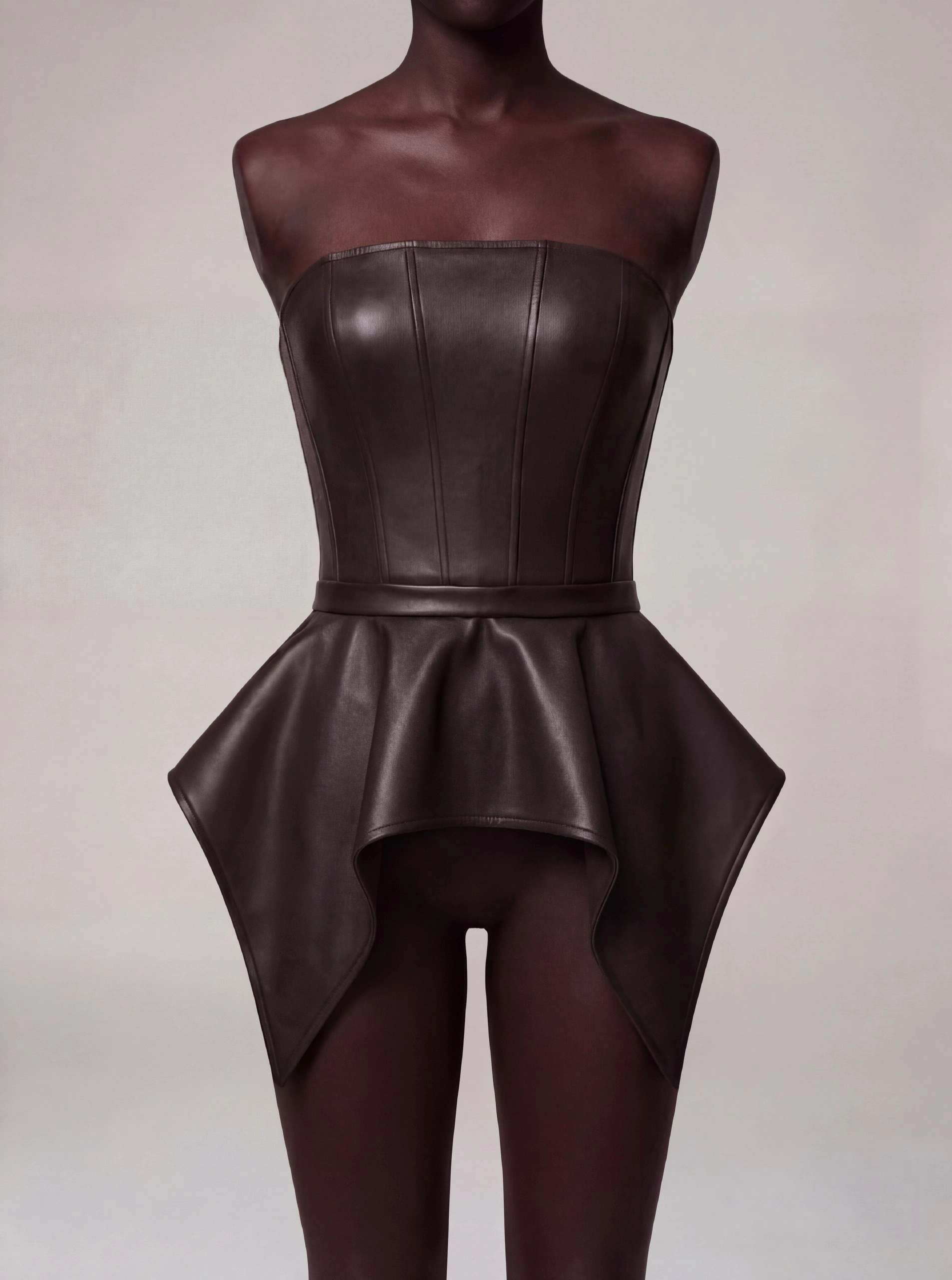 Эффектный кожаный топ-корсет с отстегивающейся баской — это база и акцент в одном флаконе.